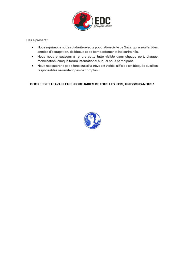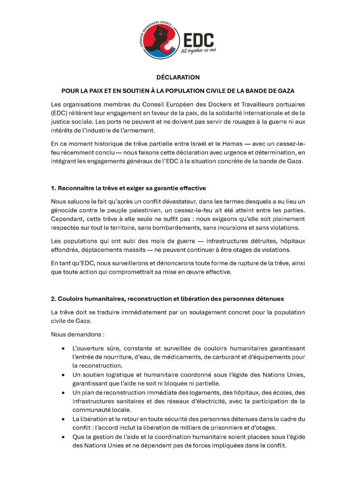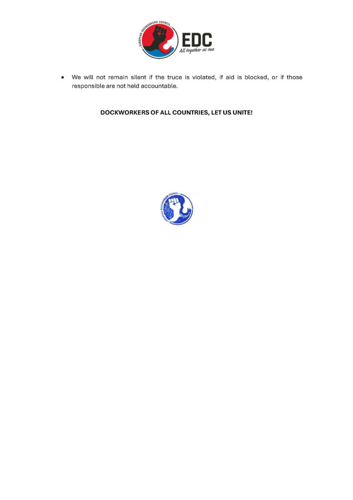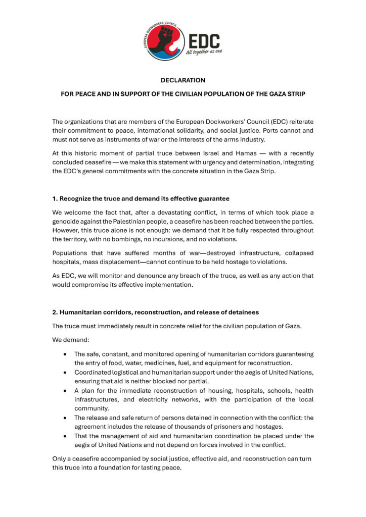 The European Dockworkers Council (EDC) demands an immediate and fully respected truce, urgent humanitarian aid and reconstruction for Gaza, a firm refusal by Dockworkers to support any military operations against civilians, and a decisive rejection of increased militarization in Europe, insisting that public resources must serve people, not war.
