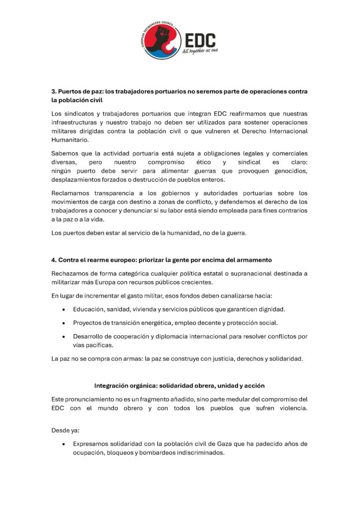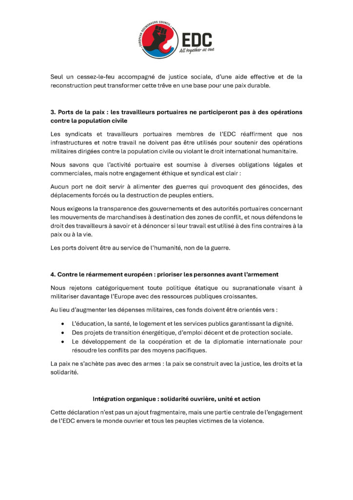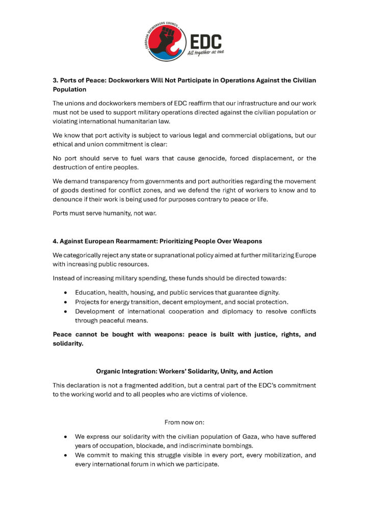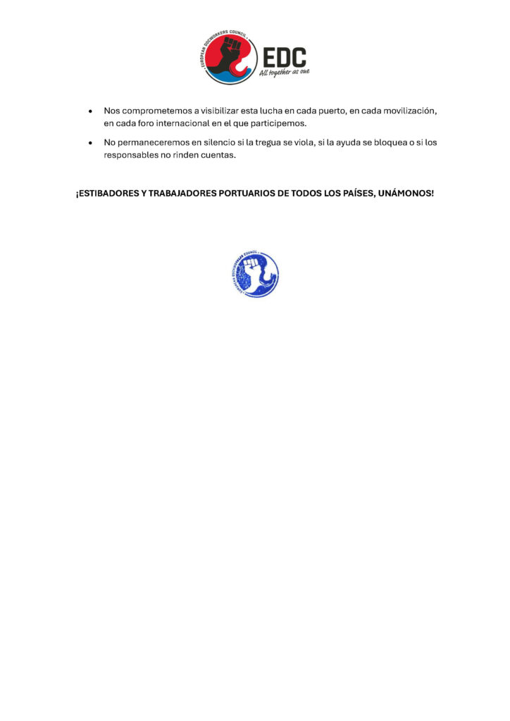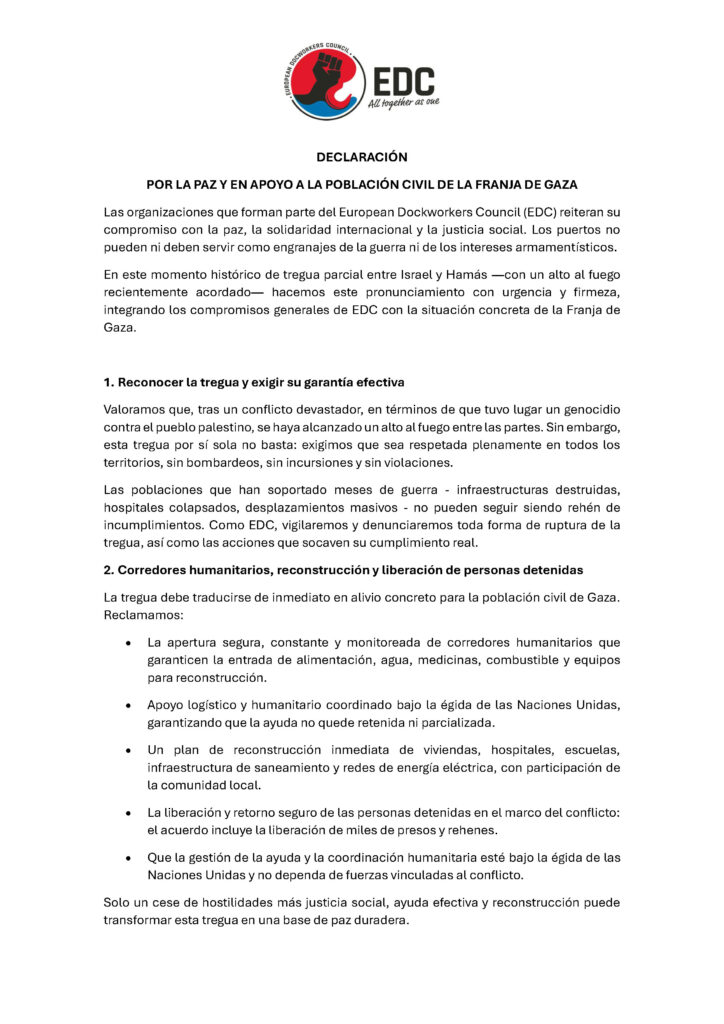 The European Dockworkers Council (EDC) demands an immediate and fully respected truce, urgent humanitarian aid and reconstruction for Gaza, a firm refusal by Dockworkers to support any military operations against civilians, and a decisive rejection of increased militarization in Europe, insisting that public resources must serve people, not war.